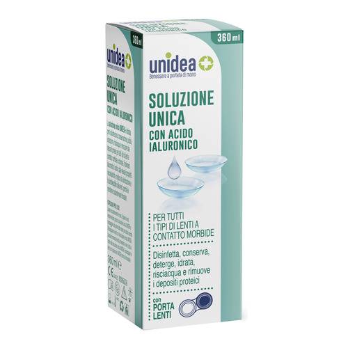 SOLUZIONE UNICADescrizione La soluzione unica UNIDEA è indicata per la disinfezione, conservazione, pulizia, idratazione, risciacquo e rimozione dei depositi proteici per tutti i tipi di lenti a contatto morbide e colorate. Il polimero ialuronato di sodio, dalle elevate proprietà viscoelastiche, migliora la lubrificazione e la biotollerabilità delle lenti, perché le mantiene costantemente idratate. Modalità d'uso Lavare accuratamente le mani. Togliere le lenti, versare alcune gocce di soluzione unica UNIDEA e massaggiare sul palmo della mano per alcuni secondi. Risciacquare le lenti con la soluzione unica UNIDEA. Lasciare immerse le l...